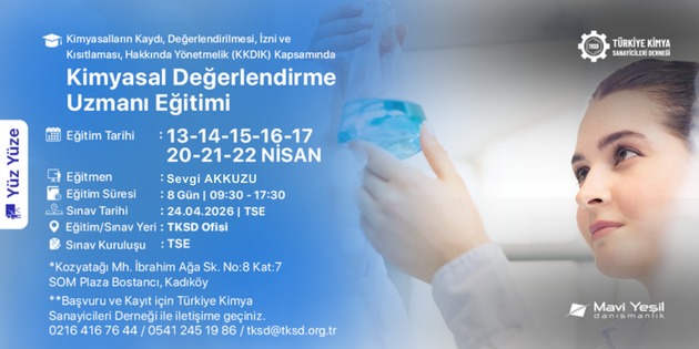 Çevre, Şehircilik ve İklim Değişikliği Bakanlığı tarafından 23 Haziran 2017 tarihinde 30105 Mükerrer sayılı resmî gazetede yayımlanmış Kimyasalların Kaydı, Değerlendirilmesi, İzni ve Kısıtlanması Hakkındaki Yönetmelik kapsamında 8 gün 64 saat Kimyasal Değerlendirme Uzmanlığı (KDU) eğitimi, TKSD ve Mavi Yeşil Danışmanlık Partnerliği ile düzenlenecektir.
